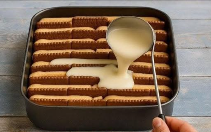 Într-o tavă adâncă sau o formă, așază un prim strat de biscuiți cu cacao.