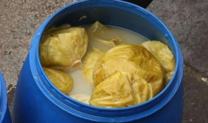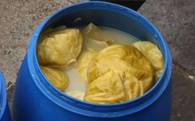 Cu această apă sărată se toarnă peste varză în butoi. Apoi, din nou, în găleată cu apă rece se dizolvă apă sărată și se continuă așa până când butoiul este complet umplut.